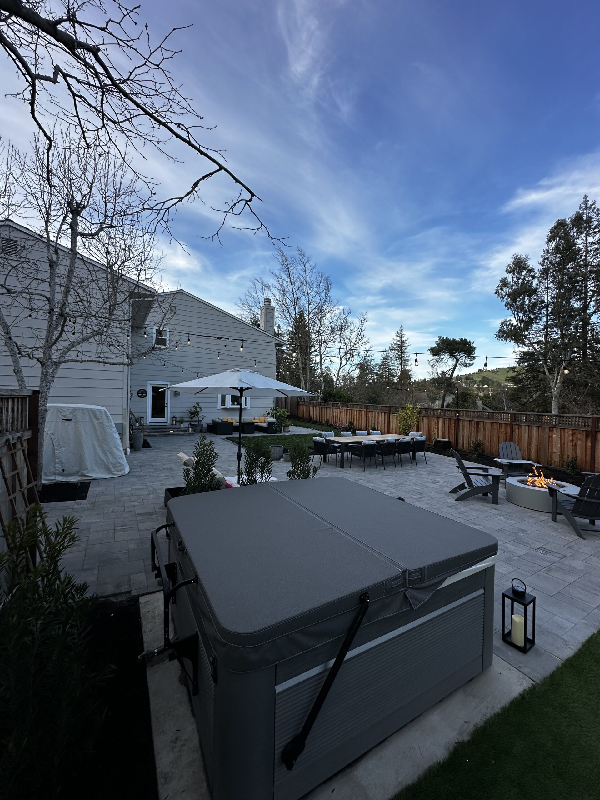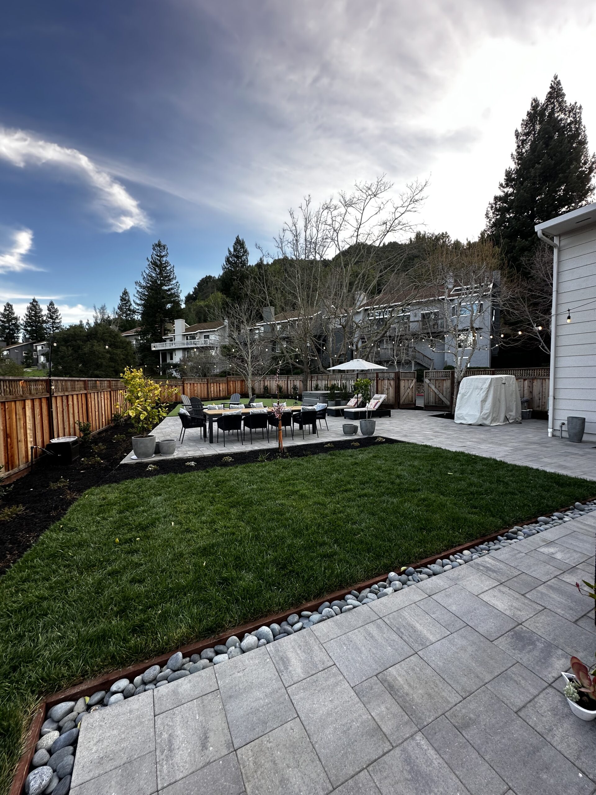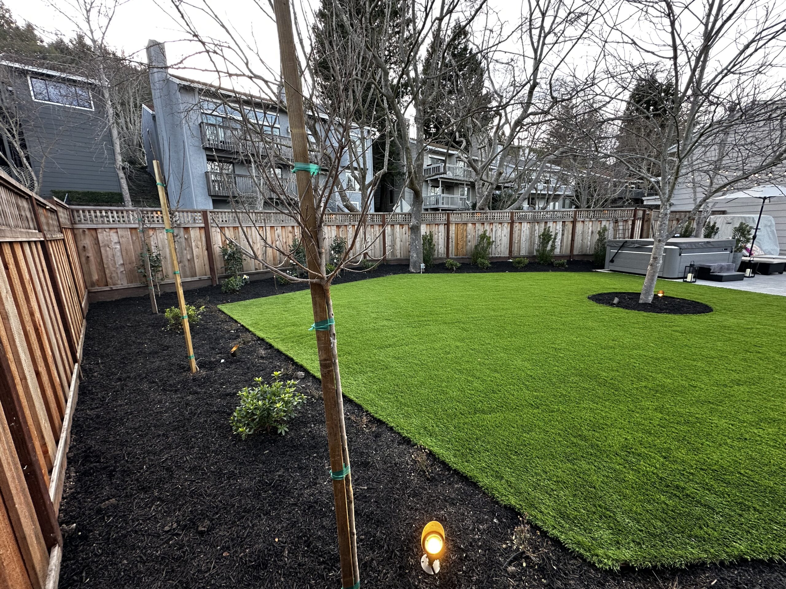 To ensure year-round beauty with minimal upkeep, we installed high-quality artificial turf, creating a lush, vibrant green lawn that remains perfect in any season. The design seamlessly integrates the hot tub area, making it a true backyard oasis. This project perfectly balances modern aesthetics with low-maintenance living.