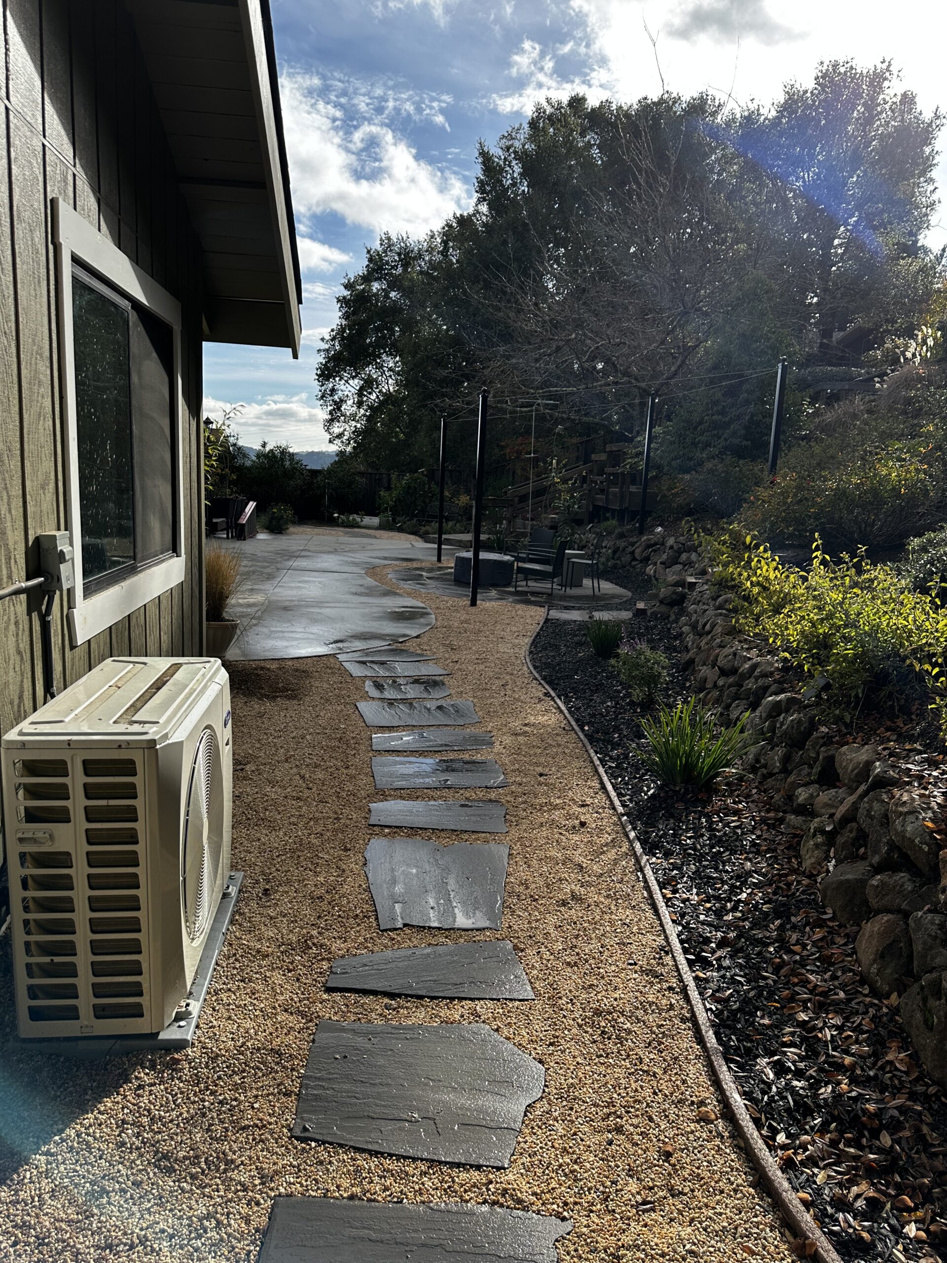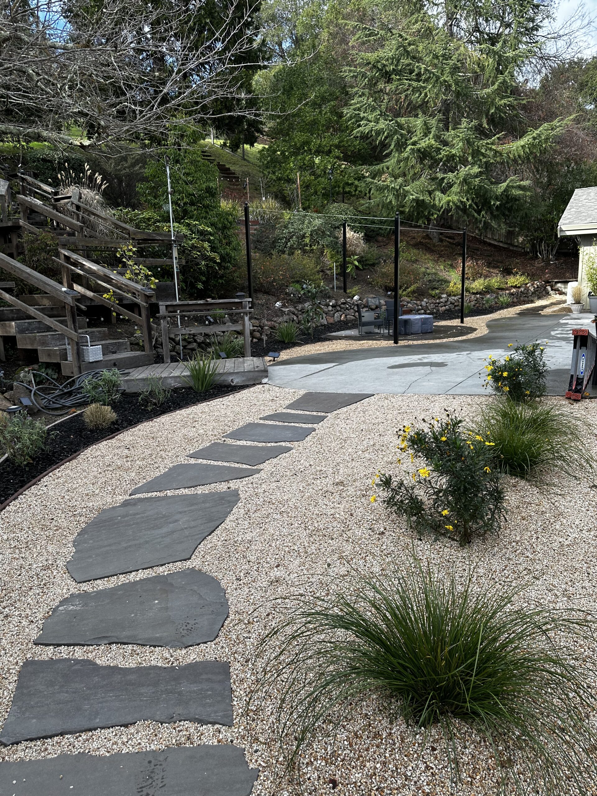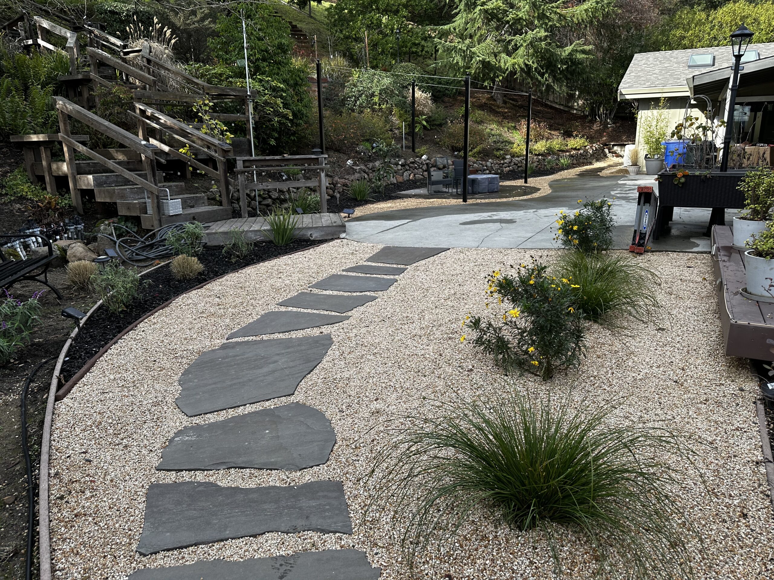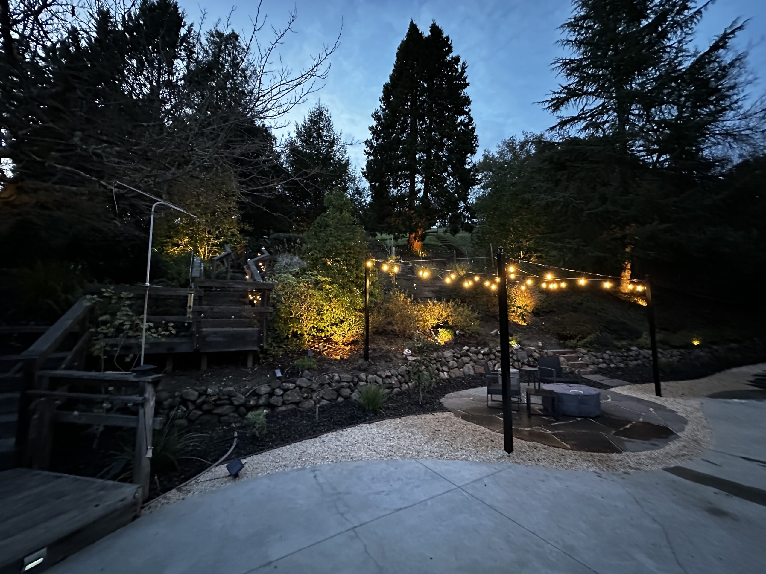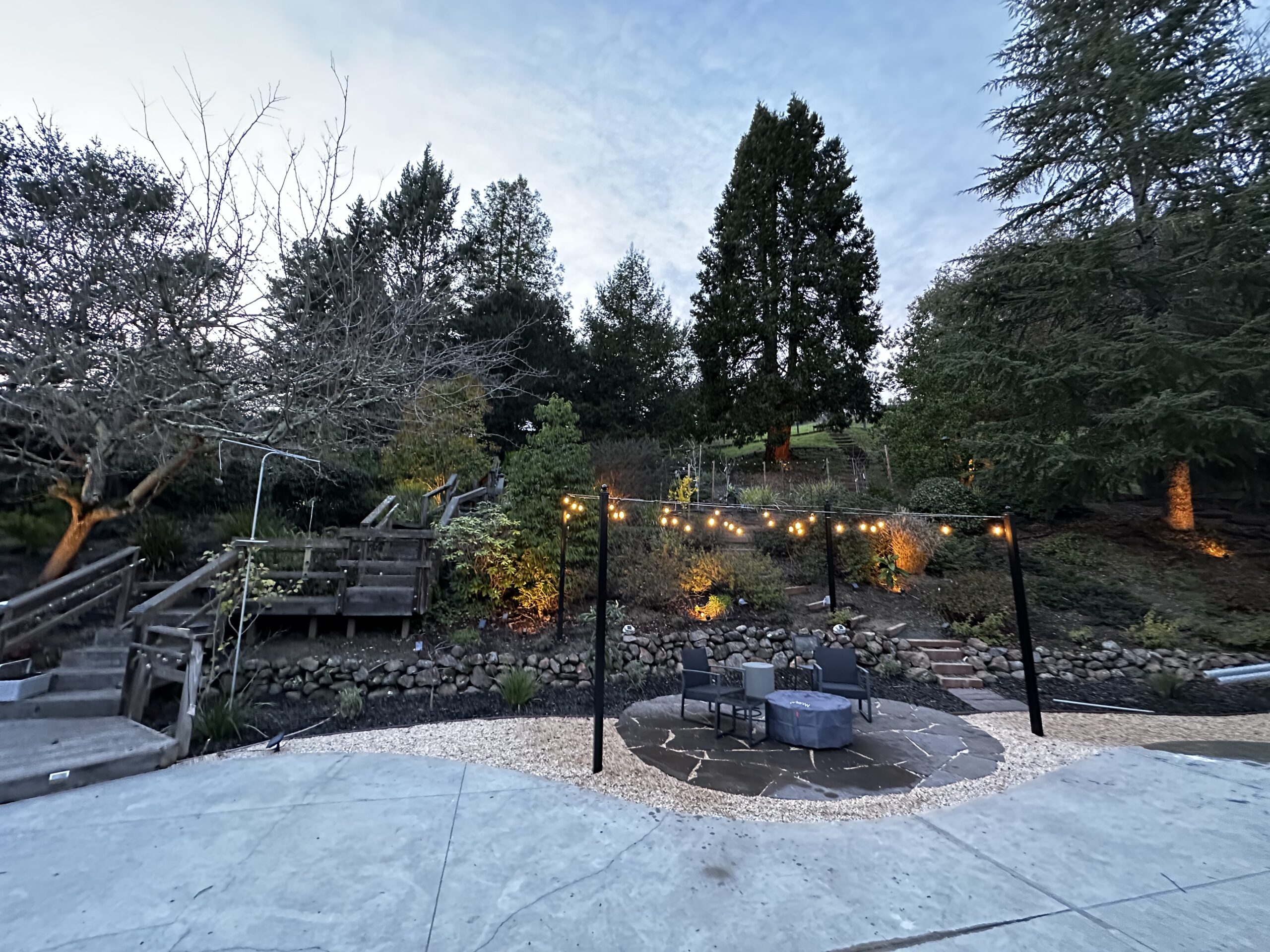 This stunning outdoor project by Eco Pacha Landscaping transforms the space into a tranquil retreat. The natural stone pathway guides visitors through a beautifully landscaped yard, with a mix of gravel and flagstone for an elegant yet practical look. The patio area, complete with comfortable seating and overhead string lights, creates an inviting atmosphere for both day and evening enjoyment. Stone steps lead up the hillside, seamlessly connecting the various elements of the space. Lush greenery and carefully placed lighting enhance the serene ambiance, making this outdoor oasis perfect for both relaxation and social gatherings.