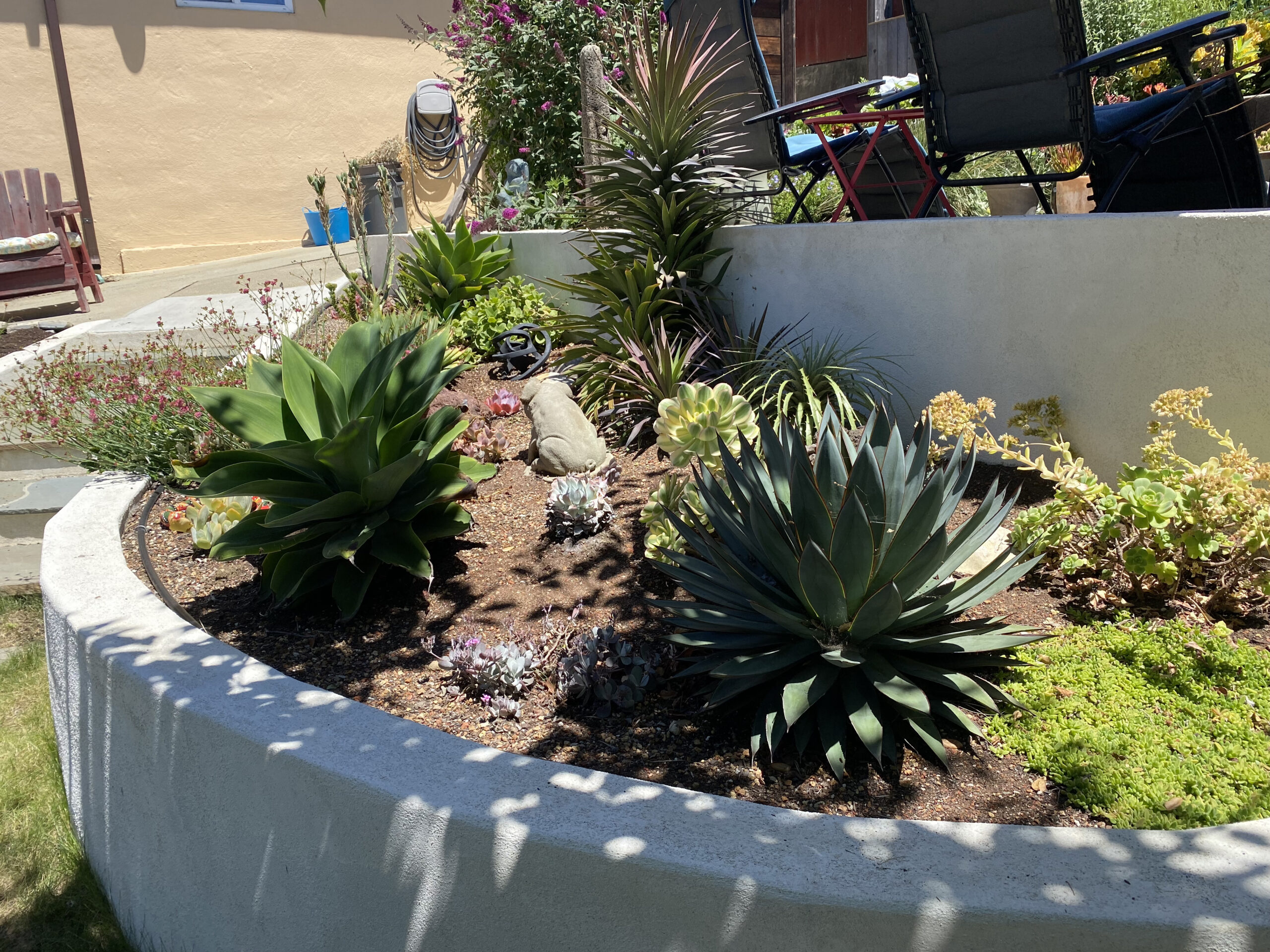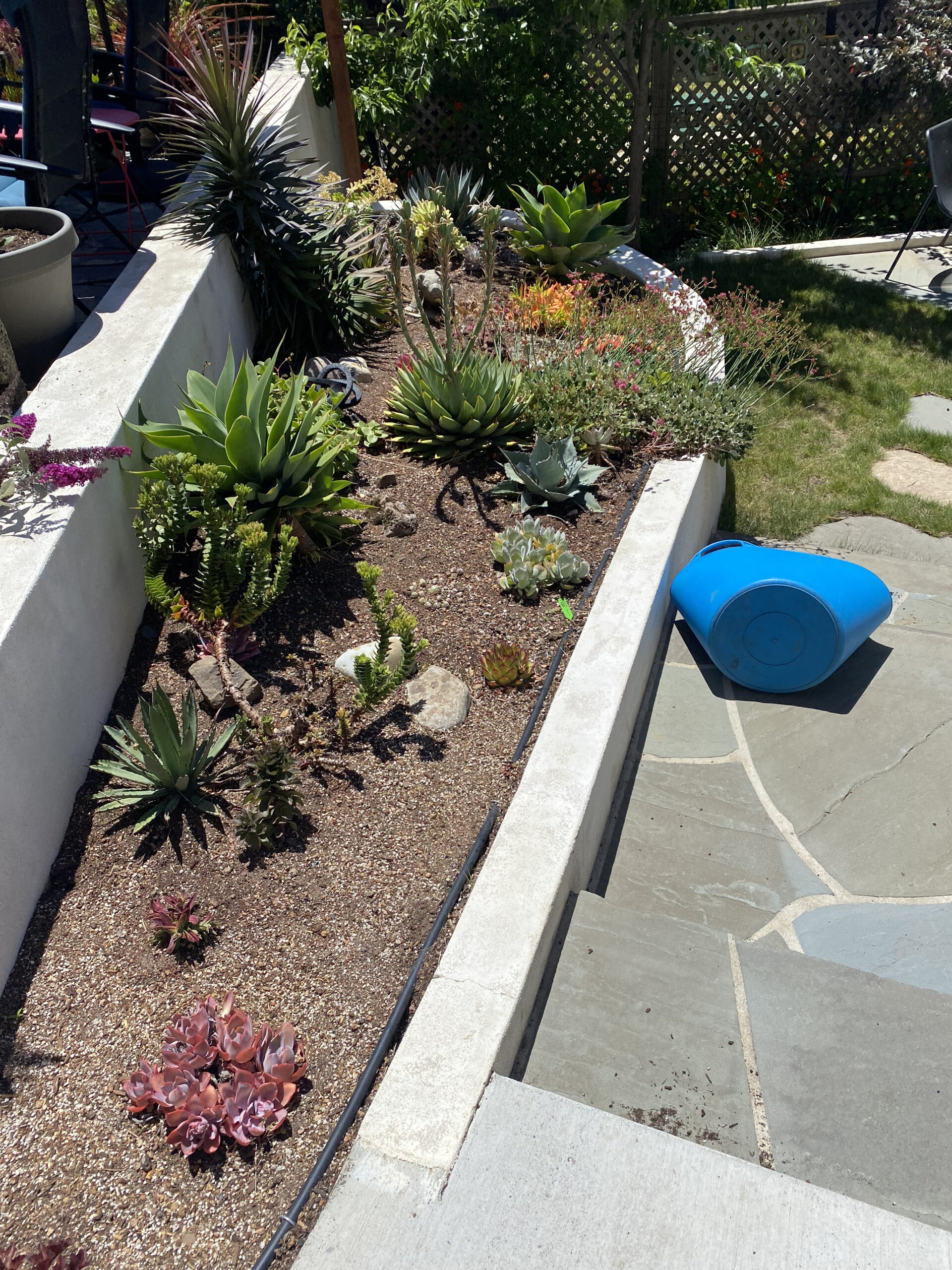 The centerpiece of the garden is a custom-built waterfall that cascades over natural stones into a tranquil pond, creating a peaceful and restorative atmosphere. The water feature is nestled within gracefully curving retaining walls, which are brimming with a rich tapestry of flowering perennials, succulents, and lush foliage. A small, green lawn with a flagstone path provides a calm space from which to admire the dynamic, thriving ecosystem we’ve created. This is more than a garden; it’s a personal sanctuary.